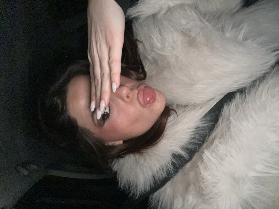 A woman reclines, wearing a fluffy, white fur coat and a black seatbelt. She playfully sticks out her tongue and covers one eye with her hand, showcasing long, white nails. She has brown hair and brown eyes. The photo is taken at an angle, and the background is dark.