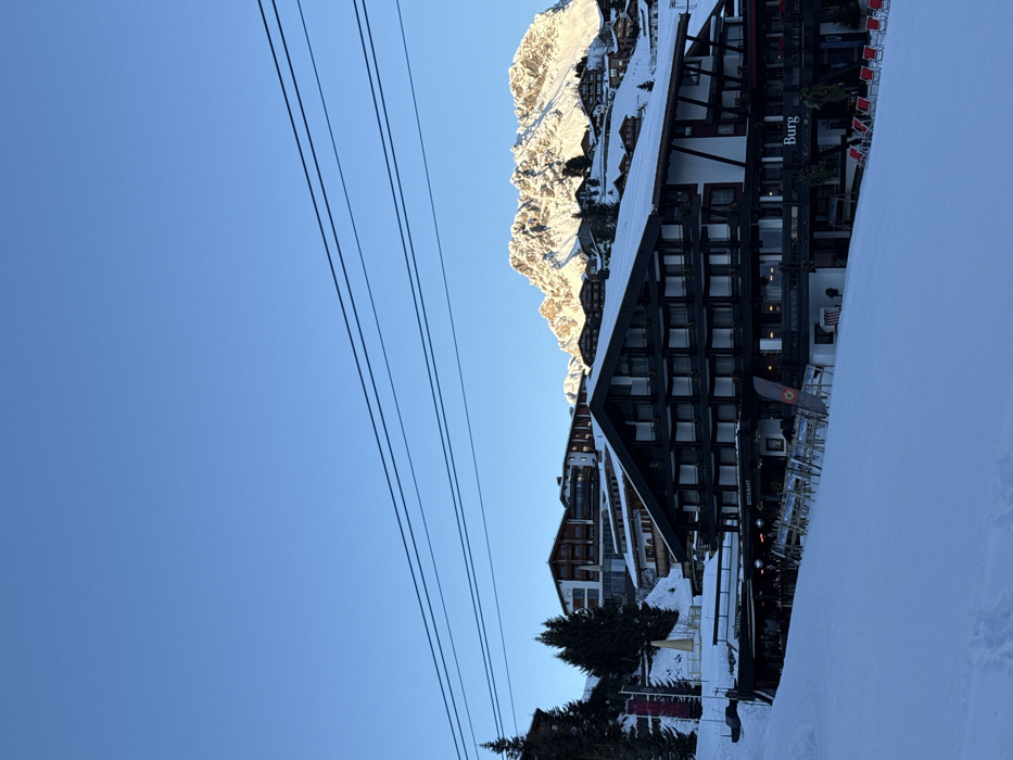 This image depicts a snow-covered alpine village scene in Lech, Austria, under a clear blue sky. In the foreground, a pristine white snow slope occupies the lower third of the frame, showing faint ski tracks. Stretching across the middle ground is a large, multi-story building, identified by a sign as "Burg" on its right side and "Restaurant" on its left. This building features numerous dark-framed windows across its facade and a snow-covered roof. An outdoor terrace area with tables and chairs, some stacked, is visible in front of the "Restaurant" section, along with a few red lounge chairs further right. Several prominent black lines, indicative of ski lift cables or power lines, traverse the sky horizontally above the buildings. Behind the main building, numerous other chalets and hotels with snow-laden roofs are visible, ascending the gentle slope. Further in the background, towering snow-covered mountains with jagged peaks are illuminated by direct sunlight, contrasting with the shadowed lower slopes. Coniferous trees dot the landscape, particularly on the left side of the frame. No individuals are clearly discernible engaging in specific actions, though the setting suggests winter sports and leisure activities.