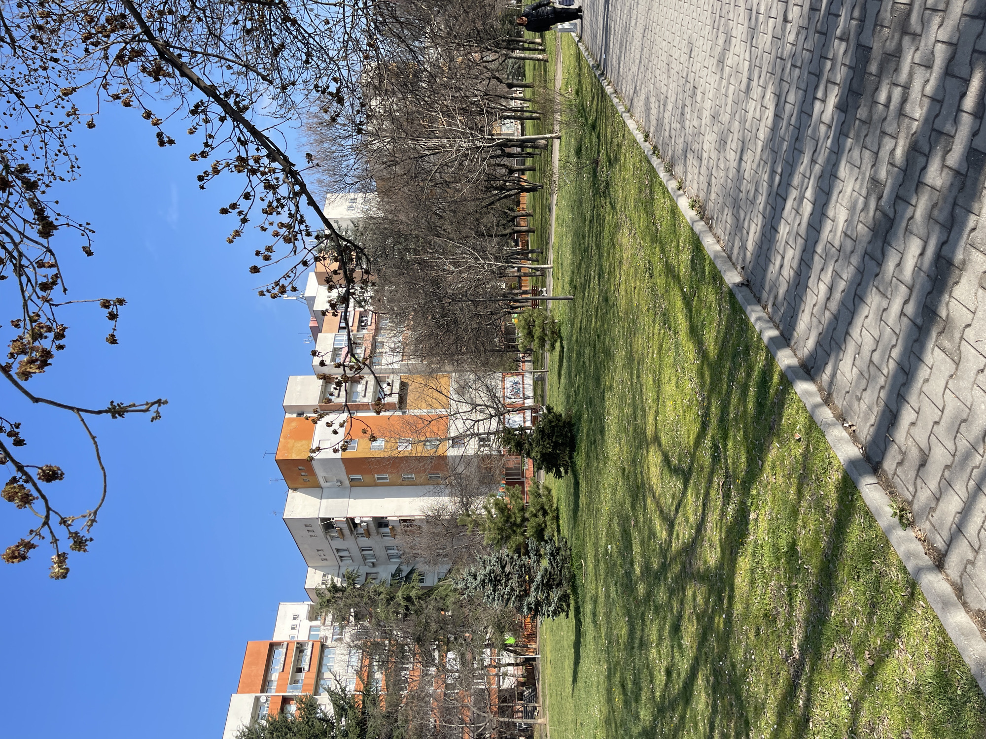 The image depicts an urban park or green space in Sofia, Bulgaria, under a clear blue sky on a sunny day, likely in early spring. In the foreground, a paved walkway of grey interlocking pavers extends from the bottom right towards the middle, bordered on its left by a concrete curb. Shadows of bare tree branches are cast across this walkway. To the left of the path, a manicured green grass area stretches into the midground, featuring several small evergreen trees and numerous bare deciduous trees, some with visible buds or dried seed pods. Tree shadows are also visible on the grass. A single individual, dressed in a dark jacket and trousers, walks on the paved path towards the right side of the frame, carrying a white bag in their left hand. In the deeper midground, a white park bench is discernible among the bare trees. The background is dominated by multi-story residential apartment buildings with facades painted in white, orange, and grey. These buildings exhibit multiple balconies, windows, and mounted satellite dishes and antennas. Bare tree branches with small brown buds or seed pods extend into the frame from the top, partially obscuring the clear sky.