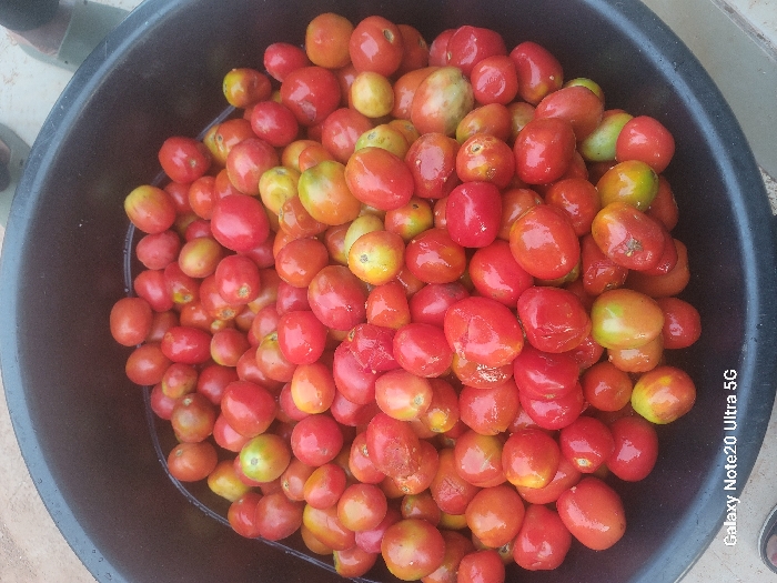 A black basin overflows with red and slightly green tomatoes, appearing freshly harvested. The tomatoes vary in size and shape, some bearing slight imperfections. They are densely packed within the basin. The scene is brightly lit. A sliver of what looks like a shoe is visible in the top left corner. The phrase "Galaxy Note20 Ultra 5G" is visible in the lower right.