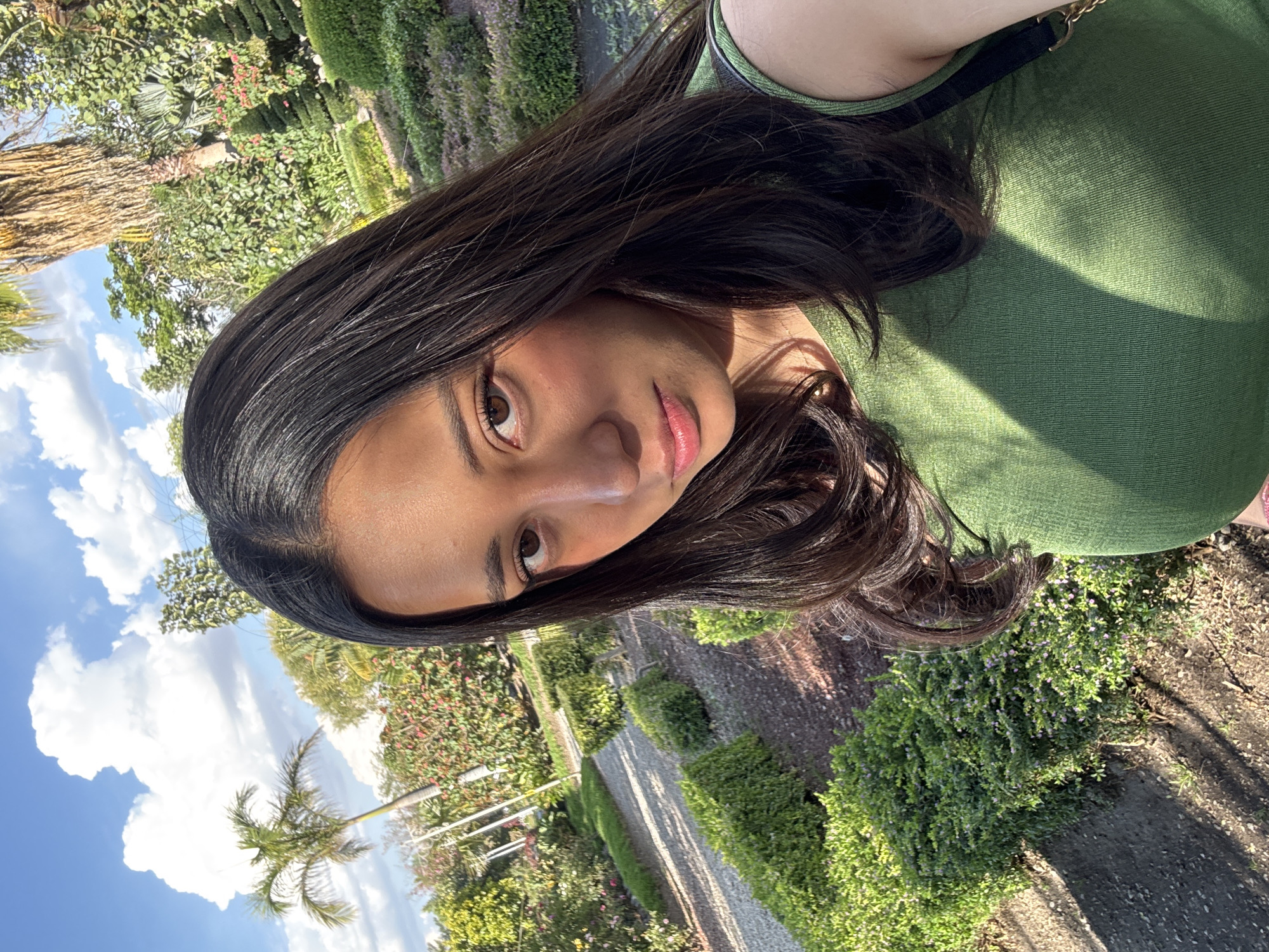 The image depicts a woman with long, dark hair and fair skin in an outdoor setting. She is wearing a green top with a black strap visible. The background includes lush greenery, trees, and a blue sky with white clouds, suggesting a garden or park. A palm tree can be seen in the background. The scene is a park in the city of Santa Ana Yancuitlalpan (Chilhuacán), Mexico.