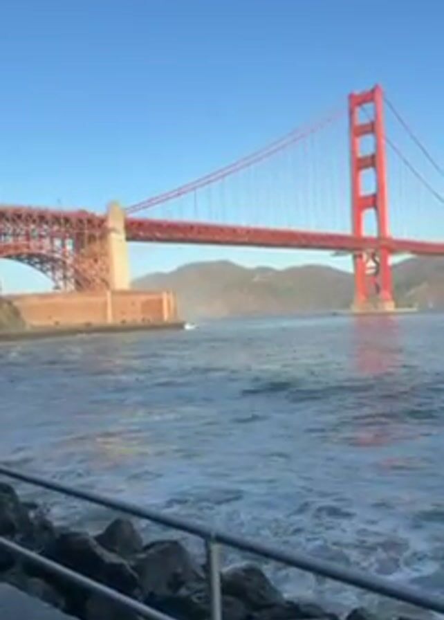 view of the Golden Gate Bridge in San Francisco, taken from ground level near the water