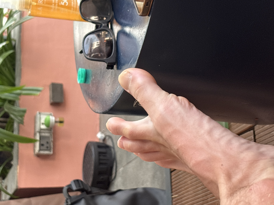 The image captures a close-up, ground-level perspective of an outdoor or semi-outdoor setting in Calangute, India, under daylight conditions. In the foreground, a bare, light-skinned human left foot is prominently displayed, extending from the lower left towards the center. The foot rests on a wooden slatted surface, with the big toe and the adjacent two toes in clear view. To the right, a dark blue cylindrical table or column occupies the midground. Resting on its surface are a pair of black-framed sunglasses, a small, bright green cap or lid, an upright orange bottle labeled "LA ROCHE-POSAY" and "50" (indicating sunscreen with SPF 50), and the upper right corner of a gold-colored smartphone. The background features a terracotta-colored wall above which green foliage is visible. Mounted on this wall are two electrical outlets, consistent with Indian standards (likely Type D and Type C/M sockets). A small green device, possibly a plug-in air freshener or mosquito repellent, is inserted into one of the outlets. To the right of the outlets, a dark rectangular object is affixed to the wall. On the ground in the background, a dark, circular object with a textured top (possibly a fan or speaker) is present, alongside a smaller, indeterminate white object.