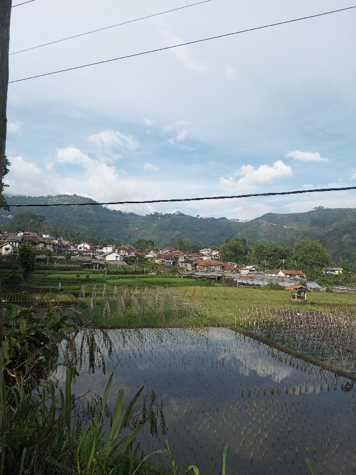 The landscape displays a village nestled against a backdrop of forested hills, set under a bright sky with scattered clouds. Rice paddies fill the foreground, reflecting the sky above. Simple homes with red-tiled roofs are visible, blending into the greenery. An electric pole is present on the left of the image. A power line stretches across the top of the frame, adding an industrial element to the otherwise natural scene.