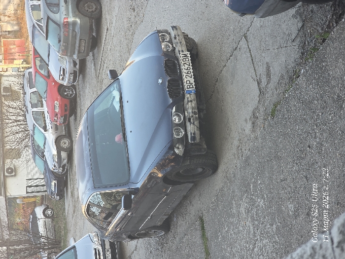 This image depicts an outdoor parking area in Vratsa, Bulgaria, on March 11, 2026, at 7:23 AM. The primary subject is a dark blue BMW 5 Series sedan, license plate BP 2662 BM, positioned diagonally on a cracked concrete surface. The BMW's front bumper is heavily damaged and partially detached, with the license plate affixed to the remaining structure. A dark sun strip is present on the windshield, and a pink object is visible on the dashboard. The front driver's side wheel is a black steel rim. To the immediate left, the front portion of a silver Opel Zafira is partially visible. In the background, a row of parked vehicles includes a dark sedan, a silver minivan, a red Volkswagen Polo, a silver hatchback, and a dark grey hatchback, many appearing with frost or dew on their surfaces. Behind the vehicles, low-rise buildings with white and light-colored facades are visible, one featuring an external air conditioning unit and a partially obscured mural. Bare trees and bushes are present, indicating a cool season. The lighting suggests early morning. No individuals are visible in the scene.