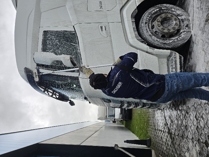 - "In the city of Ostend, Belgium, an individual is actively washing a large, white DAF XF semi-truck, which is heavily coated in white soap foam" by FM-dTRWD3, licensed under CC BY 4.0