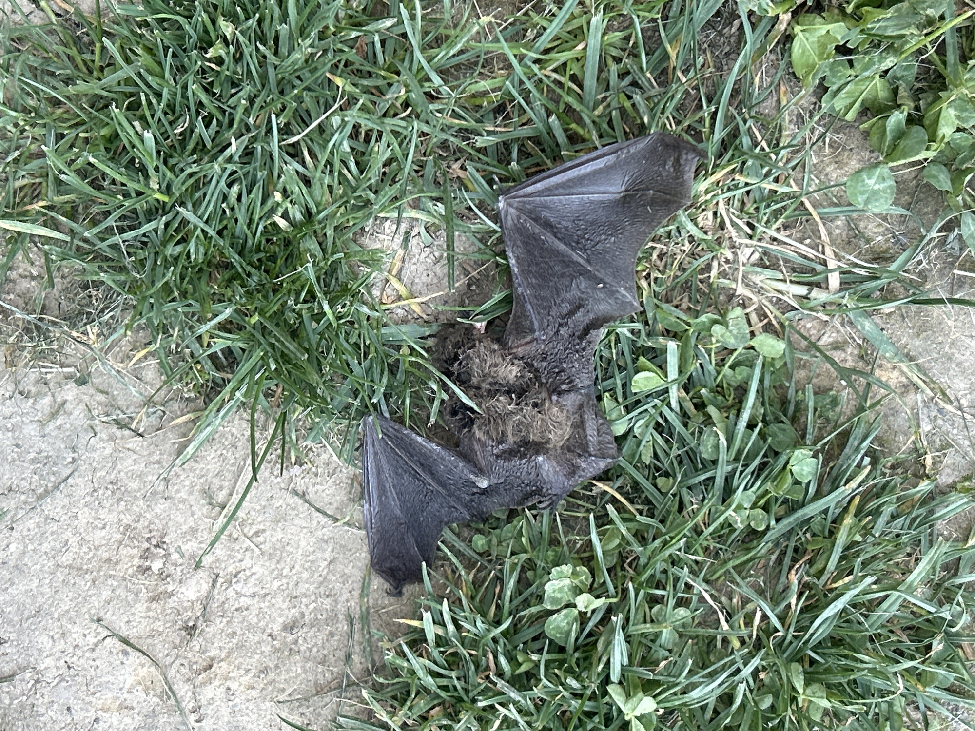 dead bat lying on grass near a concrete surface