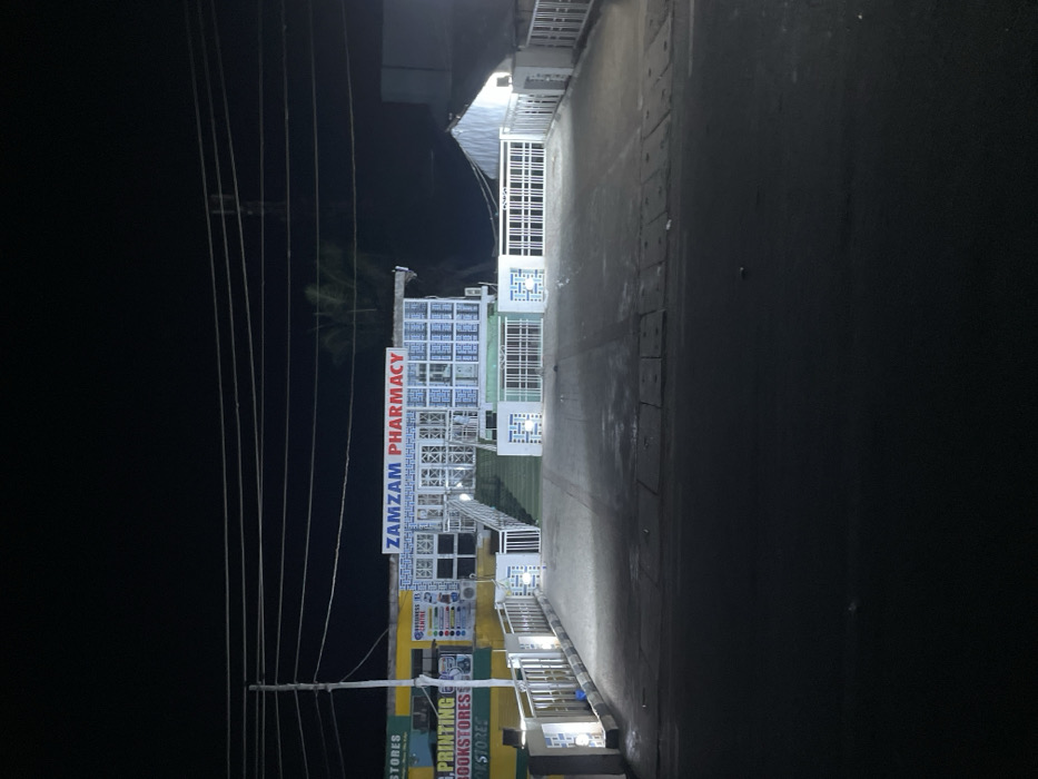 At night, a multi-story building features a "ZAMZAM PHARMACY" sign in vertical blue lettering with ornate patterns. Below, other storefronts include "PRINTING" and "BOOKSTORES" on their facades. The architecture is characterized by numerous windows, white railings, and tiled details. Electrical wires traverse the dark sky beside the building, and a dark road stretches along one side, reflecting some light.