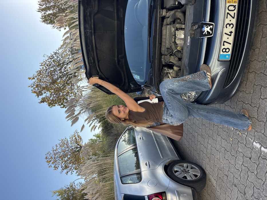 An outdoor scene in Oeiras, Portugal, depicts a young adult female posing beside a parked dark grey Peugeot hatchback with its hood open, revealing the engine