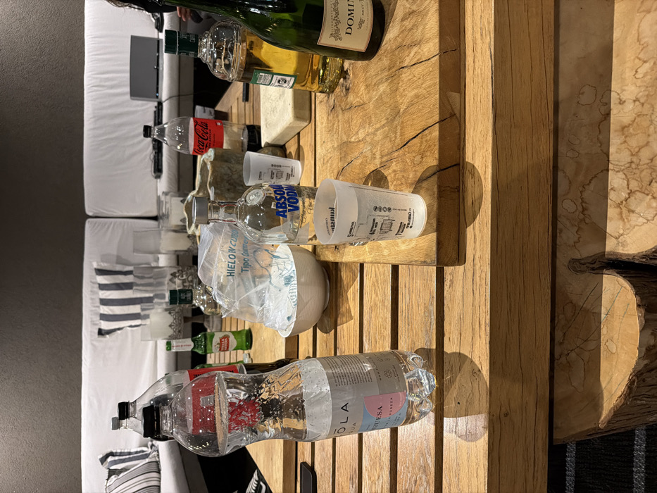A wooden coffee table displays an array of beverages: a champagne bottle, a Coca-Cola bottle, an Absolut vodka bottle, two water bottles labeled "OLA AGUA," and several Stella Artois beer bottles