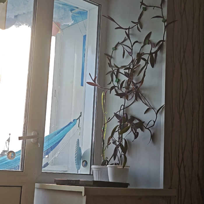The scene depicts an interior view in Kladovitsy, Russia, facing a window or balcony door. The window, framed in white, is brightly illuminated by direct sunlight from the left, causing localized overexposure. Adorning the window are several decorative elements: a light blue fabric draped in a hammock-like fashion across the lower section, circular iridescent and blue discs suspended by strings, a small rectangular blue plaque hanging from a string in the upper right pane, and what appears to be a white, cloud-like decoration at the top left, possibly alongside snow on the exterior frame. A dark silhouetted weather vane or similar structure is visible outside the lower left pane. On the white windowsill directly beneath the window, two potted plants are present. The plant on the right, in a plain white pot, features dark purplish-red elongated leaves that trail upwards against the adjacent wall. Small green decorative stones are visible among its foliage. To its left, another plant in a fluted white pot displays green leaves and a distinctive curling, bright yellow-green stem. Between these plants and the window frame, a dark rectangular object, possibly a remote control or small electronic device, rests on a black tray. The wall to the right of the window is covered with light-colored wallpaper featuring subtle, vertical, branch-like patterns. No individuals are present in the image.