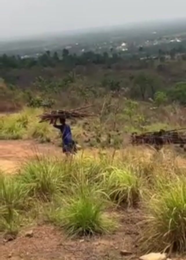 A woman in a blue dress carries a bundle of firewood on her head as she walks up a grassy hill. In the distance, a town is visible through the trees. The sky is overcast. The ground is dirt and grass. A stack of wood sits to the right of the woman.