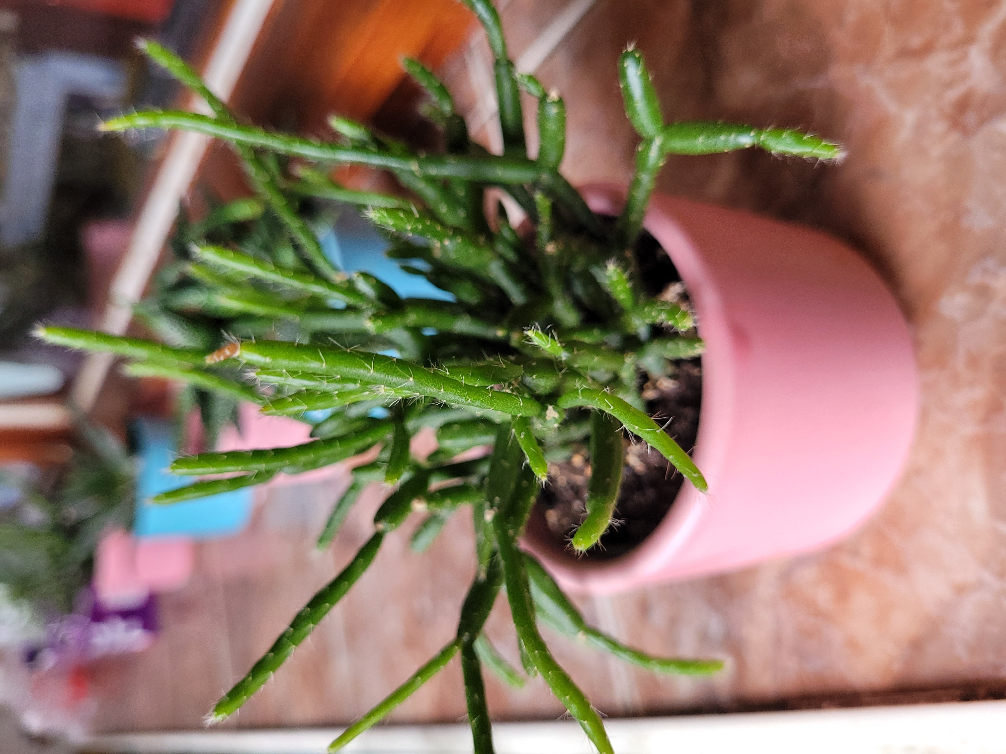 Rhipsalis plant, commonly known as a mistletoe cactus, in a pink pot