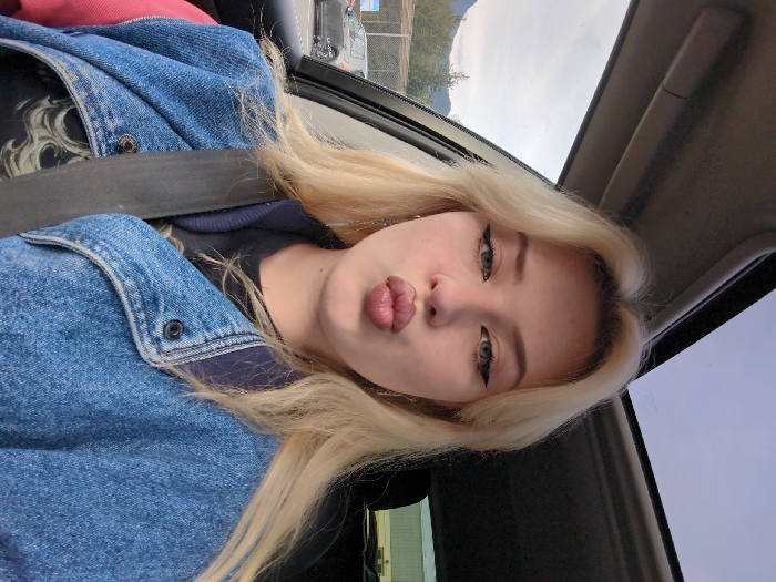 A blonde-haired female, appearing to be in her late teens or early twenties, is depicted from the chest up, seated within a vehicle