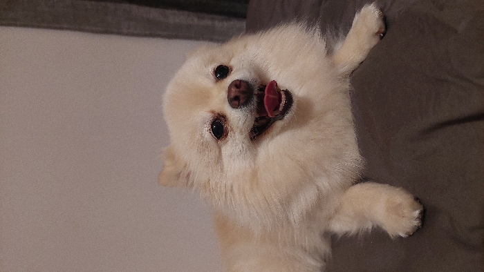 - "The image displays a cream-colored, fluffy dog, consistent with a Pomeranian or similar Spitz breed, positioned centrally within an indoor setting" by FM-Zgw5o1, licensed under CC BY 4.0
