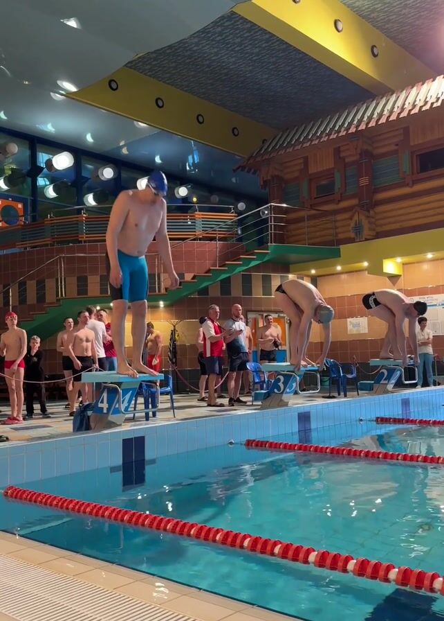- "Three male swimmers stand atop starting blocks at the edge of an indoor pool" by FM-Y3efA2, licensed under CC BY 4.0