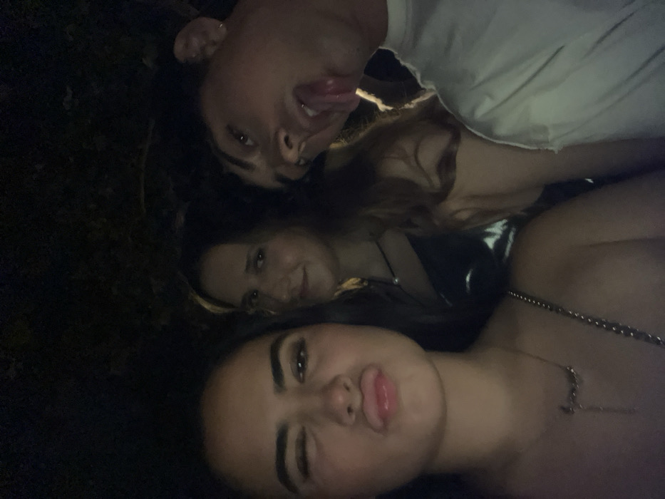 The image displays three young adults in a dimly lit setting, presumed to be in Valencia, Spain, though no specific landmarks are visible to confirm an exact location within the city. The scene features three individuals in a close-up, likely selfie-style, portrait. 1. On the left, a female with dark hair winks with her right eye and purses her lips into a "duck face." She wears a dark, possibly strapless top, a silver-colored necklace with an indistinct pendant, and a silver-colored chain strap over her right shoulder. 2. In the center, slightly behind and between the other two, another female with long dark brown hair smiles subtly and looks forward. She wears a dark top and a thin dark necklace with a small, light-colored bead or pendant. 3. On the right, a male with short dark hair tilts his head, extends his tongue playfully, and looks towards the camera. He wears a white t-shirt with a distressed collar or shoulder and a small stud earring in his visible left ear. The background is uniformly dark and indistinct, suggesting an outdoor night environment with dark foliage or a dimly lit indoor space. The lighting is ambient and uneven, highlighting the subjects' faces and shoulders while leaving the environment obscure. No specific objects or actions beyond posing for the photograph are discernible.