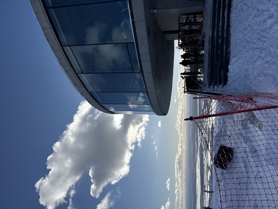 The image presents a panoramic view from a snow-covered mountain peak in Kirovsk, Russia, under a clear blue sky with prominent white cumulus clouds. The primary subject is a multi-story, modern building featuring a distinctive curved, cantilevered section with extensive floor-to-ceiling glass windows and concrete structural elements. Icicles are visible along the upper edge of the building. Below the building, an outdoor observation deck is populated by approximately three to four silhouetted individuals; one figure is positioned at a coin-operated observation telescope, while others stand or walk. Ski equipment, including skis and snowboards, is stacked vertically against the exterior wall of the building on this deck. Snow-covered steps descend from the platform. In the foreground, a red mesh safety net, supported by red poles, traverses a steep, snow-covered slope. A dark, irregularly shaped object, possibly a rock or covered equipment, is partially embedded in the snow beyond the netting. Further down the slope, two small, indistinct figures are visible on the snow, one upright and the other appearing to be in a crouched or seated position. The background reveals a vast, low-lying, snow-covered or frozen landscape extending to a distant horizon under a bright, somewhat hazy sky, characteristic of a high-altitude vantage point overlooking the Kirovsk region. Sunlight, appearing to be from a low angle, casts reflections on the building's glass facade and highlights the clouds.