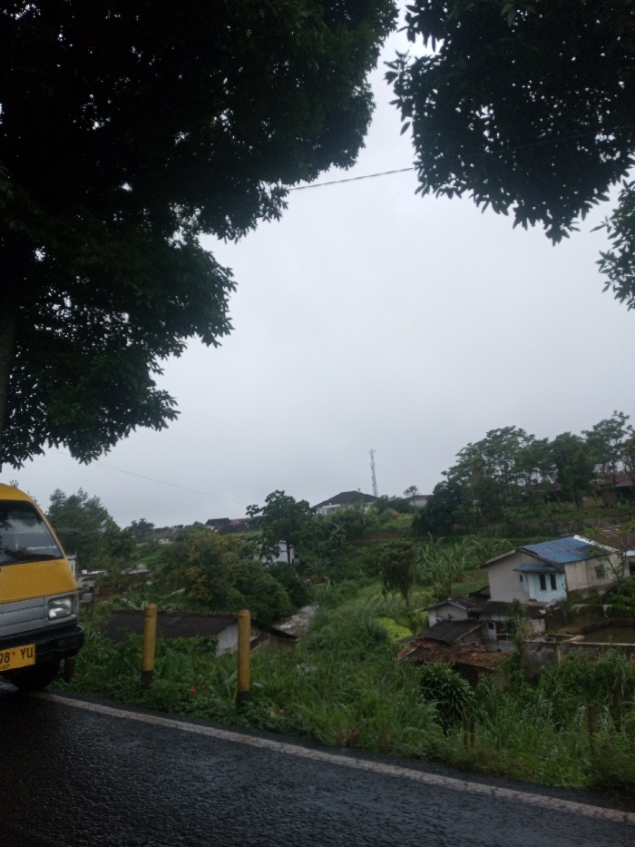 A hazy sky looms above a verdant hillside dotted with houses and trees. A communication tower peeks above the ridgeline. In the foreground, a yellow van partially obscures the left side of the frame, parked along a wet asphalt road bordered by vegetation and yellow posts. Overhanging branches frame the top of the image.