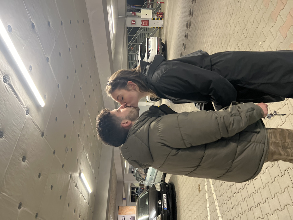 The image depicts two young adults, a male and a female, kissing in profile within an underground parking garage in Sofia, Bulgaria
