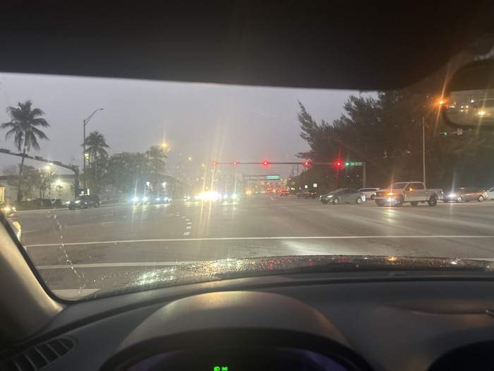 The image depicts an urban intersection in Doral, Florida, viewed from the interior of a stationary vehicle during conditions of precipitation or a recently wet environment
