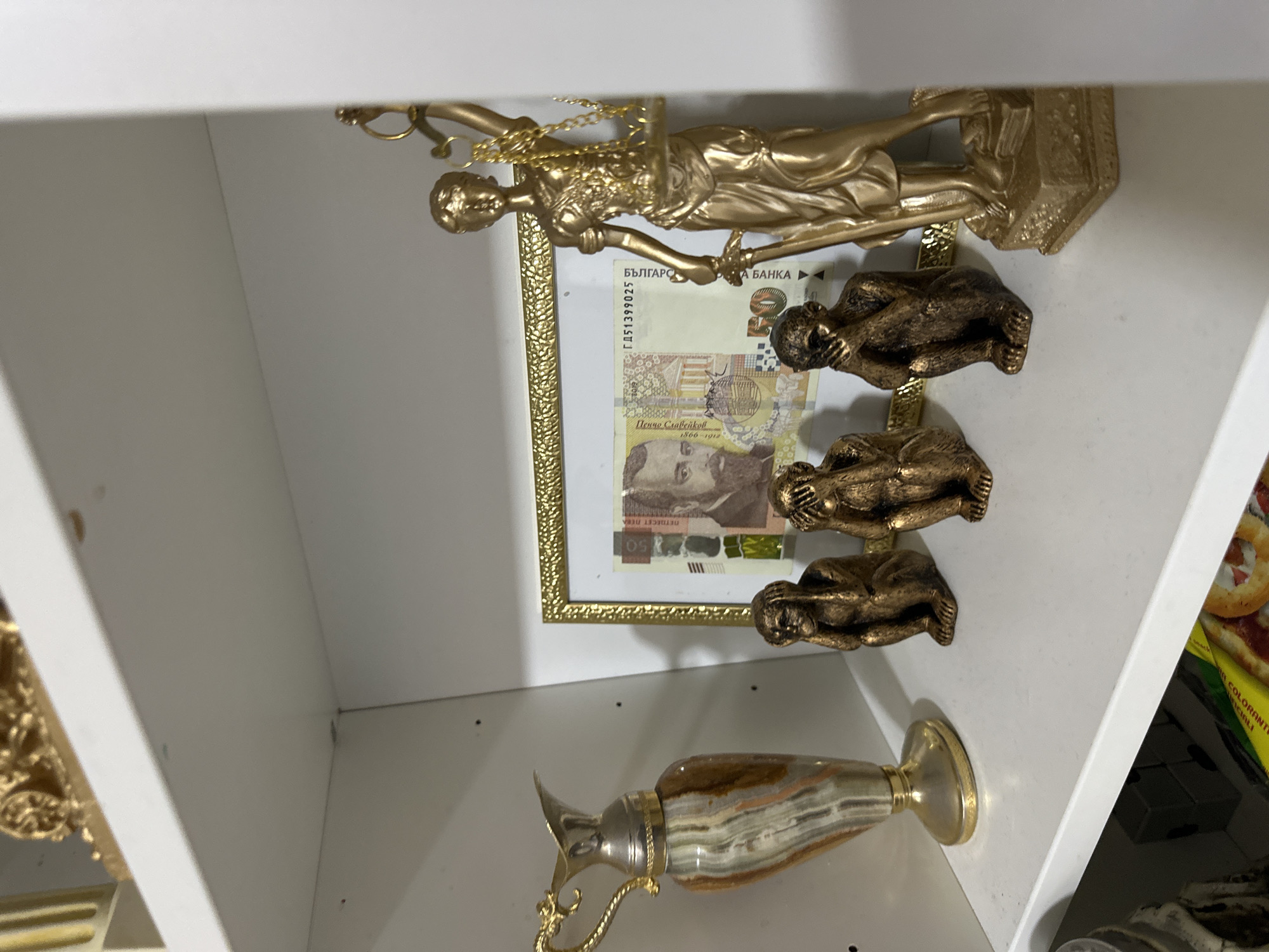 A white shelf displays various decorative items. On the left, a metallic pitcher features a silver-colored upper section, a gold-colored ornate handle and base, and a central body with vertical striations of brown, beige, and grey. To its right, three small, dark bronze-colored monkey figurines are arranged, depicting the "hear no evil," "see no evil," and "speak no evil" poses. Behind these figurines, a white-matted, gold-bordered frame encloses a Bulgarian 50 Lev banknote, partially displaying the serial number "ГА51399025" and a portrait of a bearded man. To the far right, a gold-colored statuette of Lady Justice stands, holding a sword in her right hand and scales in her raised left hand; her left foot rests on a book-like object. The white shelf above is visible, as are portions of a yellow package and a food container on the shelf below.