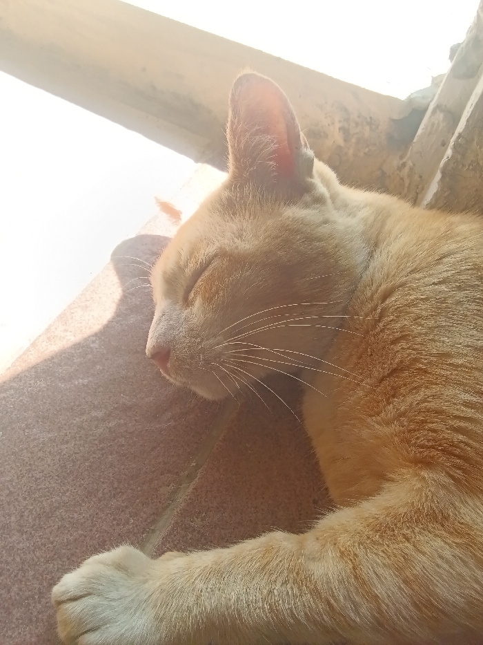 - "A close-up view shows a ginger cat asleep on a textured, reddish-brown surface, possibly tiles or concrete" by FM-BCfv12, licensed under CC BY 4.0