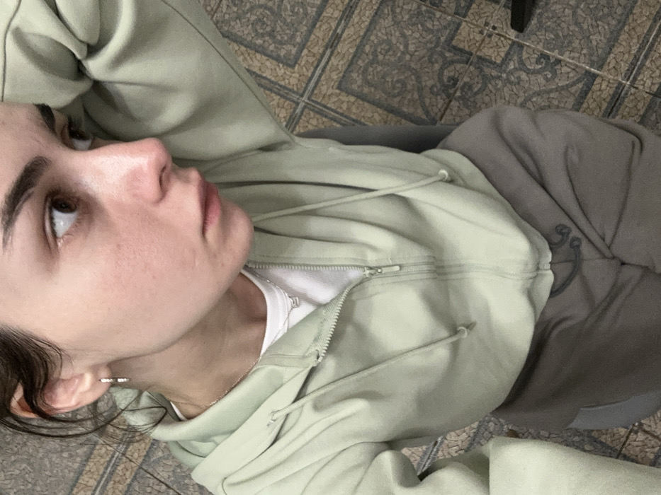 An indoor scene, purportedly in the city of Nekrasovskiy, Russia, features a young adult female captured from a slightly elevated perspective. She is visible from the upper chest to the upper thighs. Her complexion is fair, and she has dark hair and dark, defined eyebrows. Her brown eyes are directed towards the upper right of the frame, indicating a gaze away from the camera. She wears a light green, full-zip hooded sweatshirt over a white crew-neck t-shirt. The sweatshirt zipper is partially open, exposing the white t-shirt and a delicate silver-colored chain necklace with a small, elongated rectangular pendant. She is also wearing small, silver-colored hoop earrings in both ears. Her lower attire consists of light brown or taupe sweatpants with a visible drawstring closure and a darker, stylized anchor or similar design printed on the front left thigh area. A section of gray fabric is visible beneath the sweatpants on her left side. The environment features a tiled floor with a repeating geometric pattern composed of brown, beige, and dark gray squares and shapes. A dark, indistinct object or shadow is present in the lower right corner of the frame.