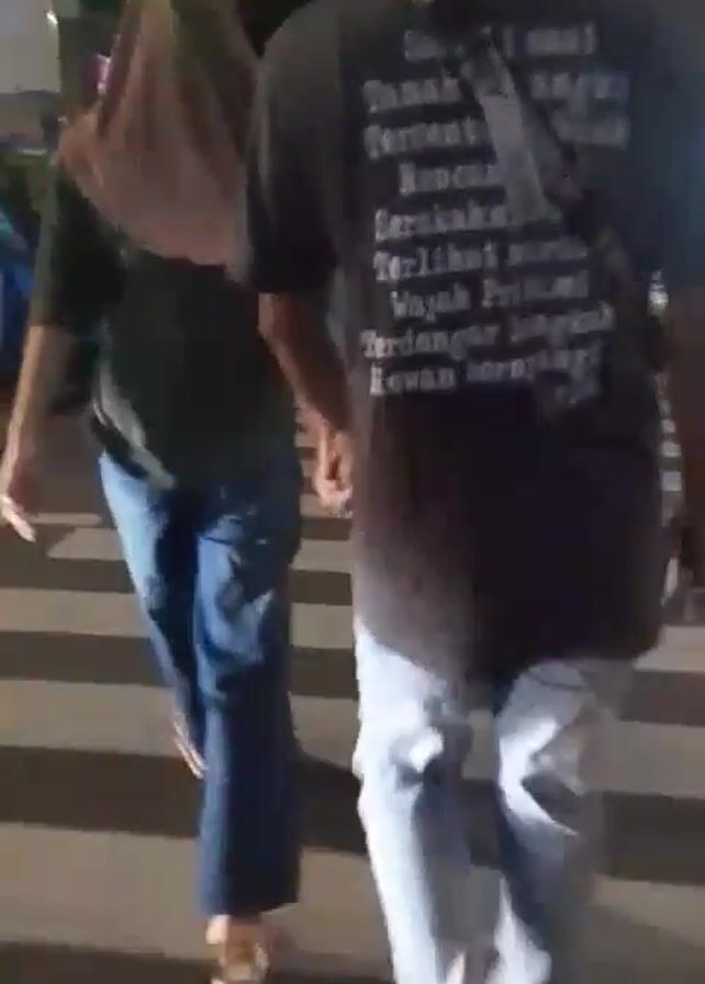 low-angle, shaky perspective of people walking across a crosswalk at night. Several people are visible, wearing casual clothing such as jeans and t-shirts. One person is wearing a t-shirt with a text print on the back. The crosswalk is marked with white stripes, and the street appears to be dimly lit. In the background, there are blurry images of street vendors or stalls and other pedestrians. The camera moves along with the people walking.