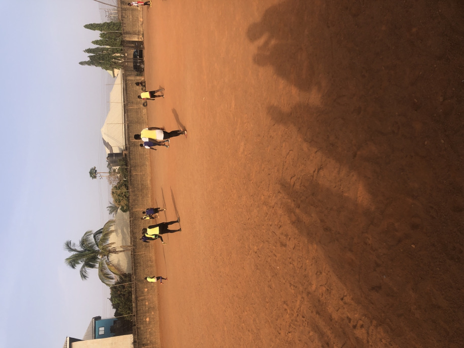 A brown, clay-like field is occupied by several people. One wears a yellow vest and dark shorts and shoes while running. Others, also in workout attire, are scattered across the field. Shadows stretch from the figures. A green fence lines the side of the field with trees and buildings visible behind it. The sky is pale blue.