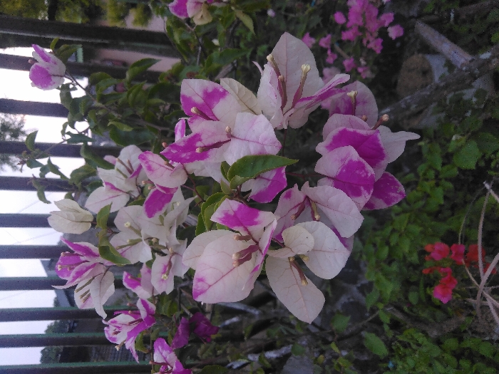 This image captures a close-up view of a variegated Bougainvillea plant in an outdoor environment in Tessenderlo-Ham, Belgium. The primary subject consists of numerous Bougainvillea blooms, characterized by bracts that are predominantly white or pale pink, prominently streaked and patched with vibrant fuchsia and magenta. Small, light-colored true flowers are visible at the center of several bracts, surrounded by green foliage. In the upper background, a dark, vertically-slatted fence or railing is visible against an overcast or bright sky. A grey, textured stone wall or foundation is partially present to the left of the main plant. The lower foreground includes additional green ground cover, with a small cluster of red-orange flowers in the lower-left quadrant and blurred pink-purple flowers in the lower-right. No individuals or animals are present, and no specific actions are depicted within the frame.