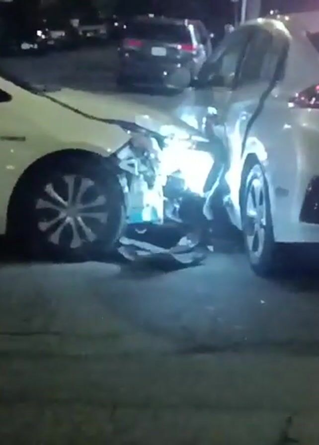 At night, two white cars, one appearing to be a Toyota Corolla and the other possibly a Hyundai Ioniq, are situated with their front ends smashed together, indicating a collision