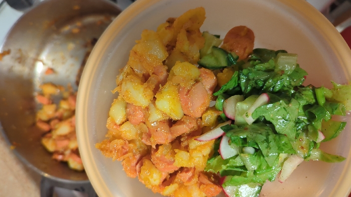 The image presents a close-up, high-angle view of a meal contained within a light orange plastic bowl. The bowl is divided visually into two primary food components. The upper section consists of cooked, diced potatoes intermixed with irregular slices of frankfurter-style sausages, all coated in a vibrant orange-yellow spice mixture. The lower section of the bowl holds a green salad, primarily composed of chopped lettuce leaves, multiple thin slices of radish displaying white interiors and pink edges, and visible green cucumber slices. In the blurred background, a metallic pot, likely stainless steel, contains additional quantities of the potato and sausage mixture, indicating a food preparation or serving environment. No individuals, actions, or specific interactions are depicted. The precise location within Modiin-Maccabim-Reut, Israel, cannot be determined from the visual content of the image, which solely focuses on the food and immediate surroundings consistent with a domestic kitchen or dining setting.