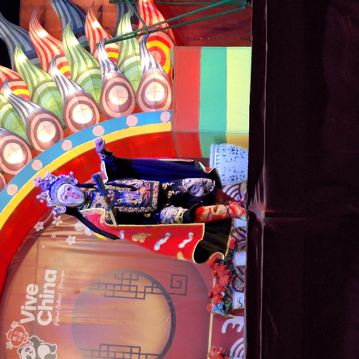 A Chinese opera performer in full costume and elaborate mask is featured in front of a stage backdrop. The backdrop displays the "Vive China" logo, a traditional window design, and decorative elements. Above the performer, there are colorful lanterns and vertical striped panels in shades of red, green, and yellow. A dark curtain is seen on the right side of the image.