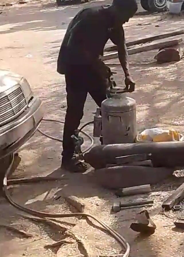 A man dressed in black is operating a gas cylinder in what appears to be a mechanic's yard