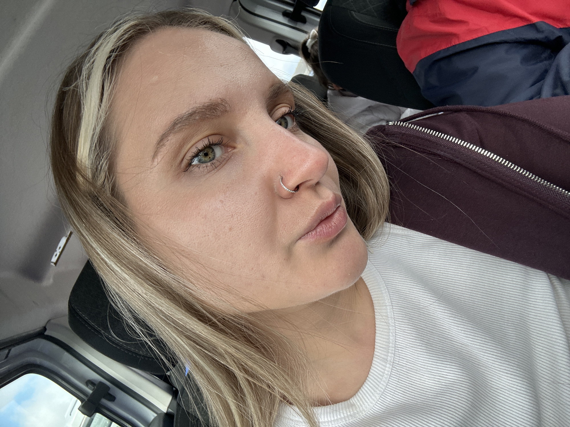A close-up selfie shows a woman with blonde hair and a nose ring, wearing a white ribbed shirt