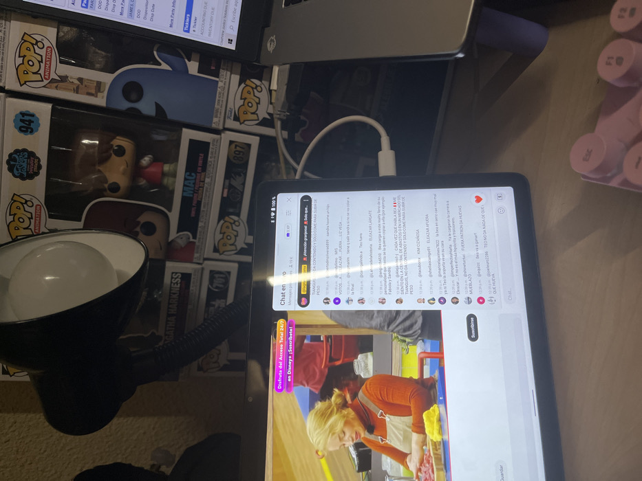 This image captures an indoor desk setup in San José Pinula, Guatemala. A black flexible-neck desk lamp with a white bulb is positioned above a tablet, which is actively displaying a live video stream alongside a scrolling chat window. The video feed shows a light-skinned woman with blonde hair, wearing an orange overall-style apron over a dark long-sleeved shirt, preparing what appears to be raw meat on a yellow cloth. The chat window, labeled "Chat en vivo" (Live chat), displays numerous comments in Spanish, including critical remarks such as "ELEAZAR LÁRGATE" (Eleazar get out) and "FUERA PATRON DA HUEVAS" (Out with the annoying boss/patron). A pink banner at the top of the tablet screen advertises "Disney+ | ¡Suscríbete!". Behind the tablet and lamp, multiple Funko Pop figures in their original packaging are stacked, including "MAC" (#941) and "AGATHA HARKNESS." To the right, a silver laptop is open, displaying what appears to be an inventory or data management interface with English text. A white cable connects to the right side of the tablet, extending towards the laptop area. In the bottom right corner, a partial view of a pink and white mechanical keyboard is visible. The desk surface is light-colored, and the background wall is a plain light hue.