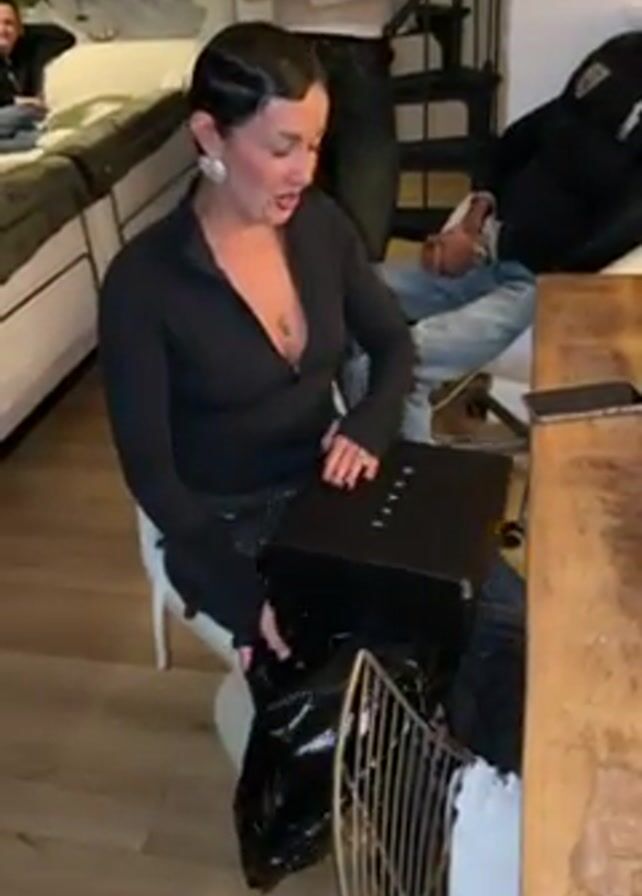 A woman sits on a white plastic chair in what appears to be an apartment with wooden floors, opening a black box labeled "GUAPE". She has short dark hair, is wearing a black long-sleeved top, jeans, and large earrings. She smiles as she pulls the box out of a black plastic bag. Behind her, other people are visible, some seated on a bed and others standing. A wooden table is to her right. Stairs are visible in the background.