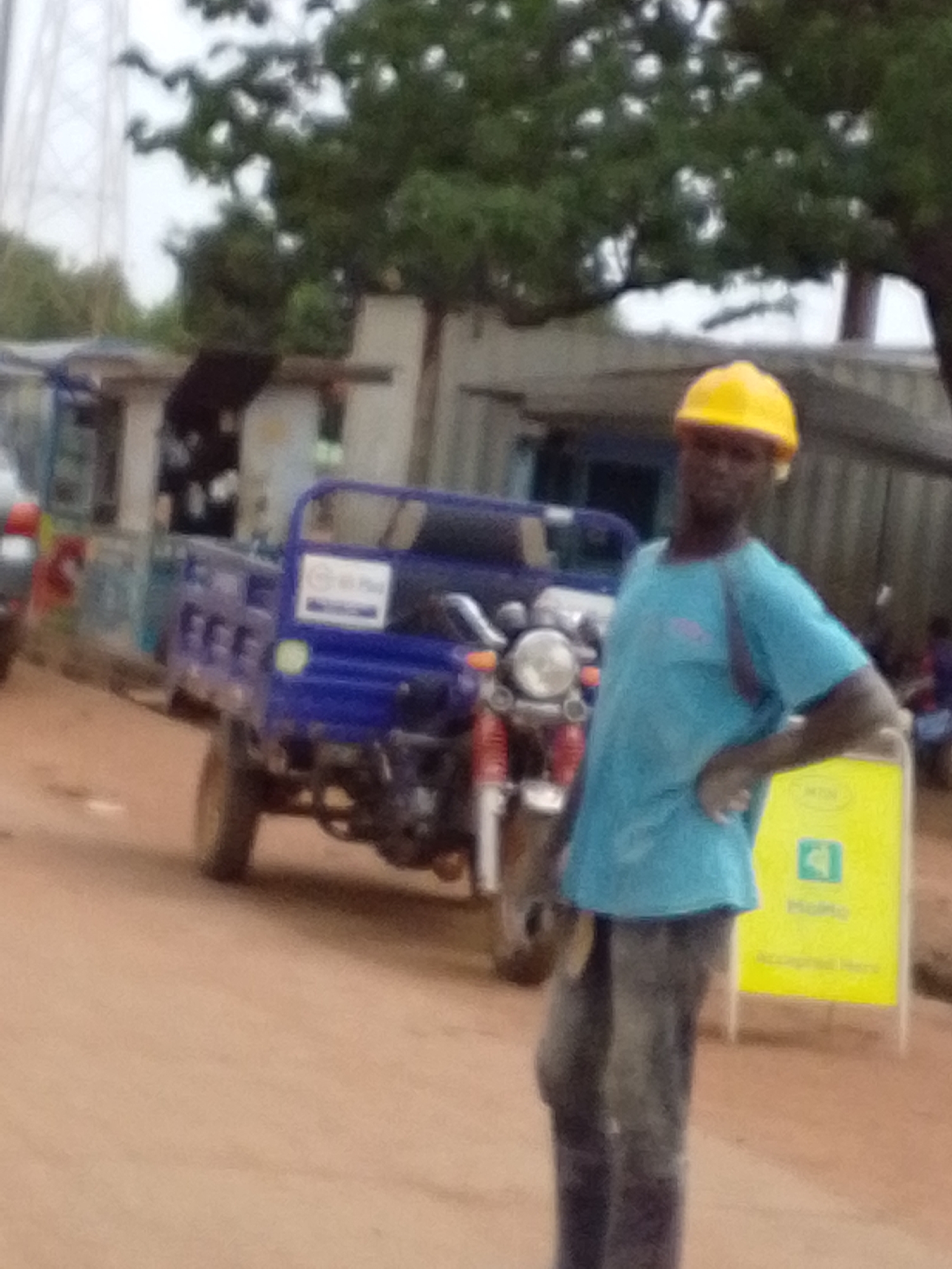 A man wearing a yellow hard hat and a light blue shirt stands in front of a blue three-wheeled motorcycle with a small cargo bed. He is standing on a dirt road or ground. Behind him is a yellow sign with black text, possibly an advertisement. Other buildings and trees are in the background. The presence of the MTN sign suggests the location may be in Ghana, and given the other context of the image, the location could be a city like Tamale.