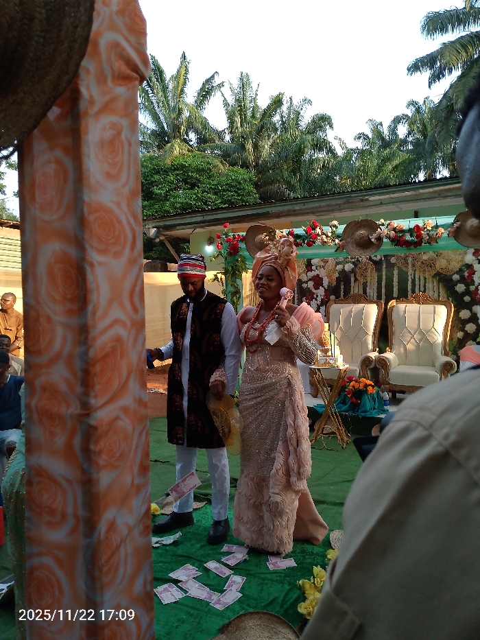 An outdoor wedding scene shows a bride and groom on a green surface strewn with banknotes. The groom is in a white shirt, dark vest, and a striped head covering. The bride, adorned with traditional beads and headwear, holds a microphone. Two ornate white chairs flank them, with decorations including flowers and straw hats above. Palm trees are in the background. Part of an orange patterned decoration is on the left, with a person's head on the right, suggesting the photo was taken from an audience member's perspective. The timestamp "2025/11/22 17:09" is at the bottom.