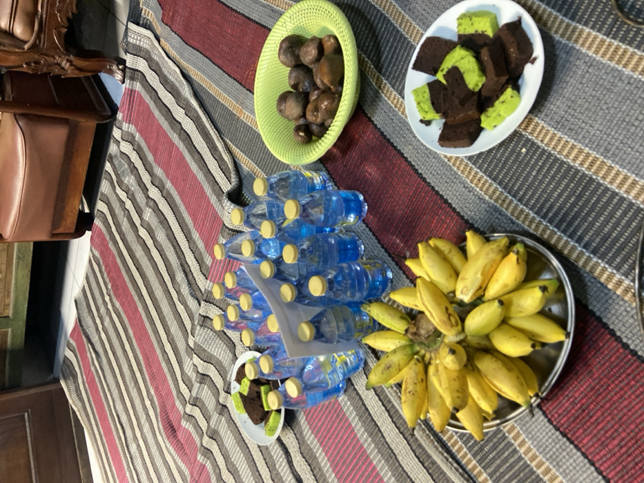 The image captures an indoor scene in Mojokerto, Indonesia, featuring an arrangement of refreshments on a striped floor rug