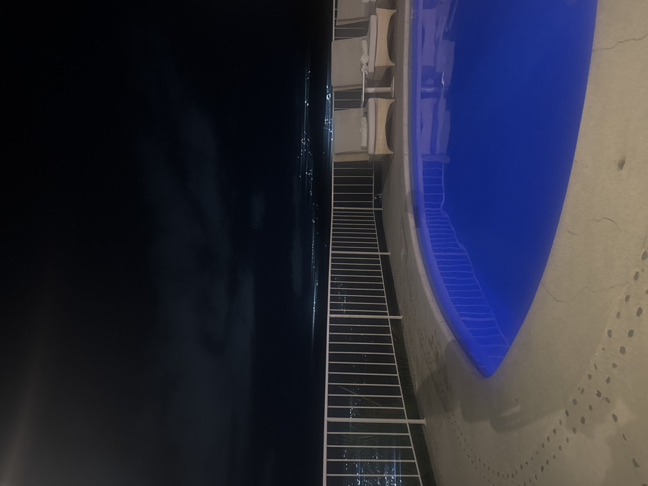 The image depicts a nighttime scene from an elevated vantage point overlooking the city of Acapulco, Mexico. In the foreground, an irregularly shaped swimming pool with illuminated deep blue water occupies the lower-center and right portion of the frame. The pool is surrounded by a light-colored concrete deck featuring a patterned series of small, circular depressions along its edge. On the deck, to the right of the pool, two light-colored, possibly wicker, lounge chairs with white cushions are positioned next to a small, white rectangular side table. A white metal railing, composed of vertical balusters and horizontal rails, extends across the mid-ground, delineating the edge of the elevated platform. Beyond the railing, the sprawling cityscape of Acapulco is visible as a vast expanse of scattered artificial lights that stretch across the dark horizon, suggesting a coastal or bay area. The upper portion of the image is dominated by a dark night sky with visible, indistinct cloud formations. A faint, bright light source is present in the upper-left corner of the sky. No individuals are present in the observable scene.
