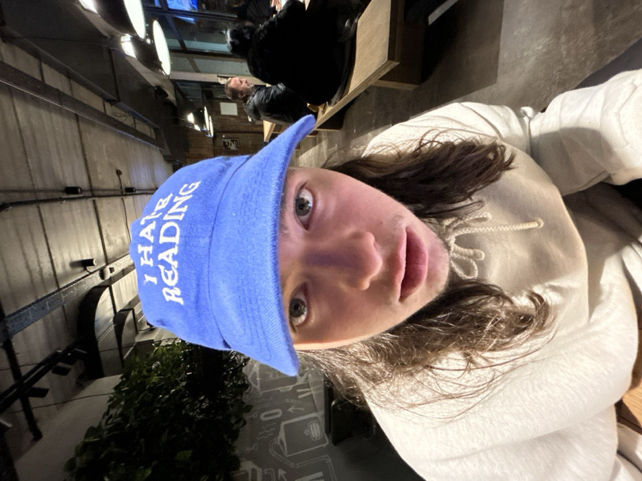 The image presents a close-up, wide-angle perspective of a young individual, likely male, positioned in the foreground and looking directly into the camera. The subject has long, dark, wavy hair, visible facial stubble, and is wearing a light beige hooded sweatshirt with a drawstring. A royal blue baseball cap with "I HATE READING" embroidered in white text is worn on the head. The subject's mouth is slightly agape, conveying a neutral expression. The background reveals an indoor public establishment, likely a cafe or restaurant, characterized by a somewhat dim, artificial lighting environment. The ceiling exhibits an industrial aesthetic with exposed pipes, conduits, and track lighting fixtures. On the left, dark green foliage or a plant wall is partially visible, above a lighter wall featuring subtle graphic line designs. On the right side of the frame, several patrons are seated at long, light-colored wooden tables with matching benches. One male individual with a beard is partially visible at a table, facing left. The precise location within Slobozhanske, Ukraine, cannot be determined from the visual evidence in the image.