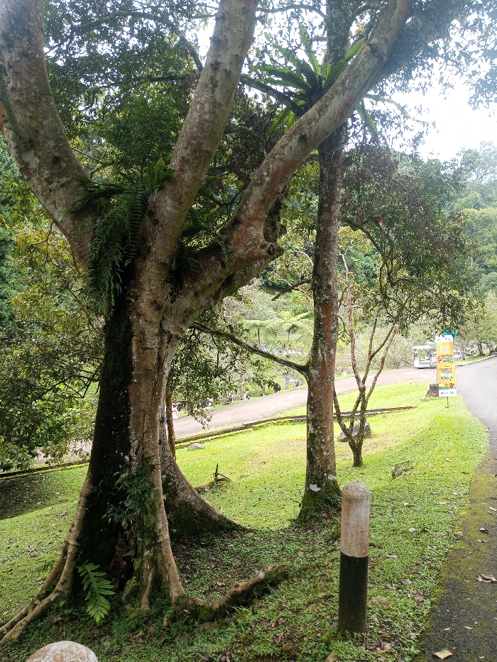 An outdoor scene in Cimacan, Indonesia, features a broad tree with multiple trunks and an exposed root system dominating the left foreground