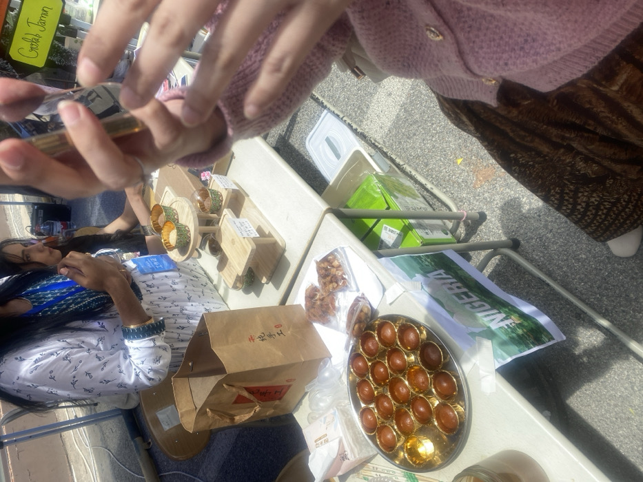 food stall in Qing Dao Shi, China at the coordinates 36.075, 120.412. Two people are present. One person is wearing a white dress with a floral pattern and a blue necklace. They are standing at a table displaying various food items, including small cakes and snacks. The other person is wearing a pink sweater and brown skirt. They are using their right hand to take a picture of the food stall with their left hand holding the phone. The scene is outside, with a light-colored paved ground, and there are some plants and a sign that reads "Goebbi Jamun" in the background.