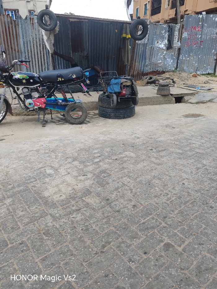 A black motorcycle is parked on a street, next to a three-wheeled vehicle atop a stack of tires. A person is lying down under a corrugated metal structure, obscured by the motorcycle and vehicles. Tires hang from the structure. The street surface is paved with gray, patterned bricks. A drain cover is visible on the street to the right. Buildings are in the background.