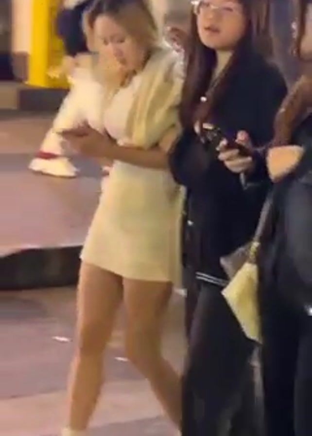 Three young women are walking together on a city street at night. The woman on the left is wearing a light-colored dress with a cardigan and has blonde hair. The middle woman is wearing glasses and a black jacket with white stripes, and she is looking at her phone. The woman on the right is wearing a black leather jacket and is also looking at her phone. They are walking close together, and the woman on the right has her arm around the middle woman. There are other people walking in the background. The lighting is dim and there are colorful lights from nearby buildings.