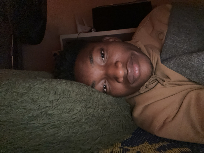 A person lies on a green, shaggy pillow and patterned blanket. They wear a tan hoodie and are partially covered by a gray blanket. Their face is relaxed, eyes open but sleepy. A dark object, possibly a fan, is positioned to the left. A white shelf with a dark object and a white tissue box sits in the background. The lighting is dim, creating a cozy and relaxed atmosphere.