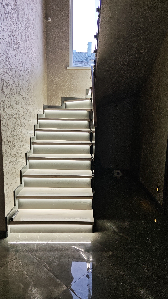 An interior view in Kladovitsy, Russia, depicts a modern stairwell. A straight flight of approximately twelve light-colored wooden or laminate steps ascends from the foreground towards the upper left, each step featuring a strip of white LED lighting beneath the front edge of the tread. A glass railing with dark metal standoffs borders the right side of the staircase. The floor in the foreground is composed of dark, highly polished stone or large-format tiles with subtle lighter veining, reflecting ambient light from the stairs and the overhead window. The left wall exhibits a light beige, textured plaster finish, upon which a small white security camera is mounted high. A large window positioned above the upper steps provides natural illumination, revealing a bright sky and the partial view of a tiled roofline with a chimney belonging to an exterior building. The right wall, in stark contrast, is covered in a dark, heavily textured material, appearing near black due to the deep shadows, and features two small, square, recessed wall lights near the floor. No individuals or specific actions are observed within the scene.