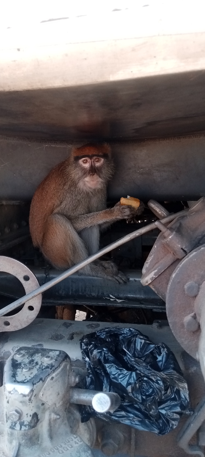 - "A Patas monkey (Erythrocebus patas) is observed sitting within an enclosed, dark space, likely an engine compartment or utility access panel, in Gwagwalada, Nigeria" by FM-MVDLR2, licensed under CC BY 4.0